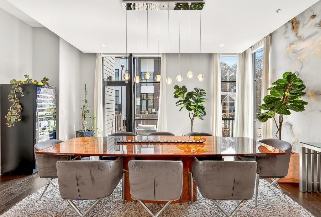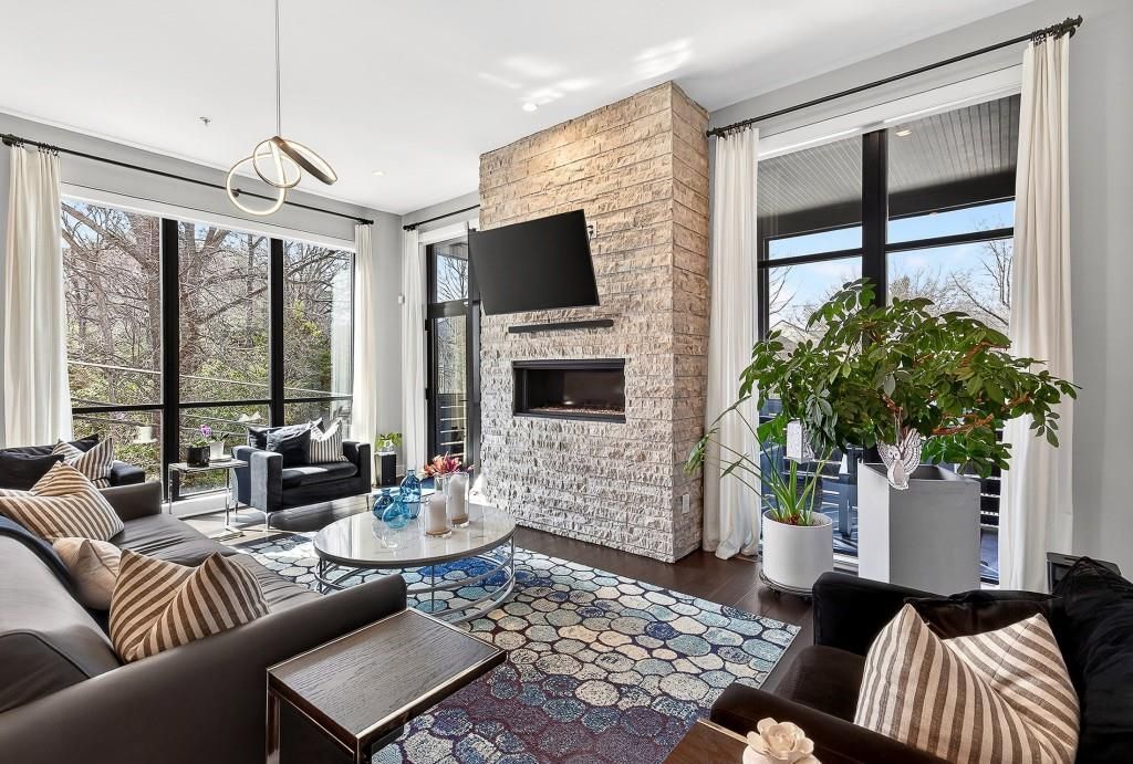 Set within the Moda- Decatur community, this exceptional end-unit townhome represents the largest floorplan available an architectural statement of modern luxury, refined with thoughtfully curated design and extensive upgrades throughout including 11' ceilings, wide plank hardwoods, designer lighting and custom window treatments. Bathed in natural light from expansive floor-to-ceiling windows, the residence unfolds across multiple levels with soaring ceilings and a seamless blend of sophistication and comfort. A private residential elevator provides effortless access to each floor, enhancing both convenience and livability. At the heart of the home, the chef's kitchen is a striking centerpiece anchored by an oversized waterfall quartz island and outfitted with premium Thermador appliances, custom cabinetry, stainless sink, and designer finishes. Adjacent living and dining spaces are elevated by a dramatic floor-to-ceiling stone fireplace and refined architectural details, complemented by remote-controlled blinds and custom drapery that frame the main living areas with both function and elegance. Designed for both everyday living and elevated entertaining, the home offers multiple indoor and outdoor gathering spaces. Four distinct outdoor living areas include a screened porch, and a rooftop retreat complete with a wet bar, fireplace, privacy enhancements, and integrated entertaining features creating a rare, resort-like experience in the heart of Decatur. The upper levels reveal a serene primary suite with custom closet build-outs and a spa-inspired bath, alongside additional bedrooms and flexible living spaces. A secondary bedroom is complemented by an exceptionally large closet with a window, offering both natural light and remarkable storage. The walk-in laundry room accommodates a full-size washer and dryer, enhanced by custom cabinetry and shelving, and is discreetly enclosed with a sliding barn door for a polished finish. The terrace level offers exceptional versatility, featuring a private en-suite bedroom and an additional bonus room with remote-controlled blinds ideal for a home office, media room, or quiet retreat. Thoughtful storage solutions are integrated throughout the entire home, including pull-out kitchen shelving systems, custom closet installations, and built-in organization features. The garage is a notable enhancement, exceeding what is typically found within the community, and features natural light from a window, custom Garaginization cabinetry, a wall-mounted storage system, and a powered overhead rack for optimal organization and functionality. Additional enhancements include hardwood flooring throughout, under-cabinet lighting, designer wall treatments, rooftop gas line for grilling, integrated pergola features, and curated lighting selections that elevate every space. Ideally located just moments from Decatur Square, Emory University and Hospital, Glennwood Park and the DeKalb Farmers Market, this residence offers a rare combination of modern design, everyday convenience, and access to some of Decatur's most desirable destinations. Enjoy special community amenities including the saltwater swimming pool and firepit. A true statement property where modern architecture meets intentional living.